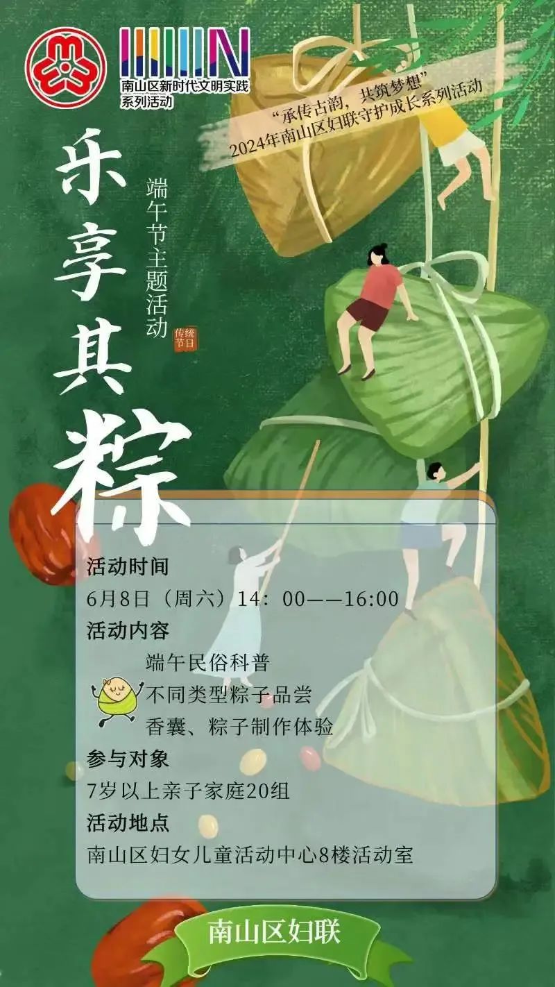 活动简介:端午节将至,为了让更多的家庭感受传统文化的魅力,南山区妇联特别推出了一场充满浓郁节日氛围的端午节主题活动,诚挚邀请市民和家人一同参与,在这个特别的日子里乐享其“粽”,共度美好时光!让我们一起承传古韵,共筑梦想!