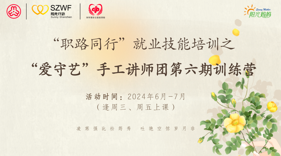 活动简介:为帮助单亲贫困、失业女性及家庭遭遇特殊困难的女性提升就业技能,深圳市妇联阳光妈妈项目开展“爱守艺”手工讲师团训练营,帮助阳光妈妈学习手工授课技能,拓宽就业渠道,重返职场。