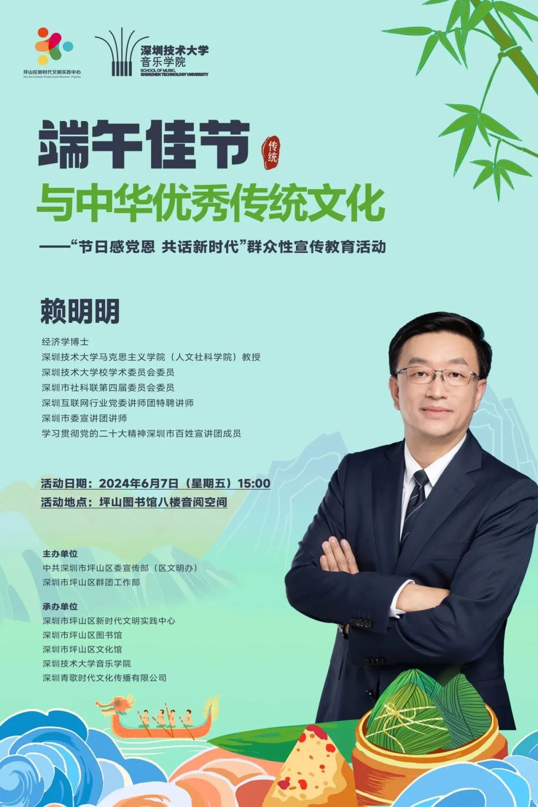 活动简介:中共深圳市坪山区委宣传部(区文明办)联合深圳市坪山区图书馆等单位,于2024年6月7日(星期五)15:00在坪山区图书馆举办“端午节与中华优秀传统文化”——坪山区“节日感党恩 共话新时代”群众性宣传教育活动。本次活动将邀请经济学博士深圳技术大学马克思主义学院教授赖明明深入讲解端午节的起源、习俗及其背后的中华优秀传统文化。同时,现场还有屈原诗画表演、原创中国舞、歌唱等精彩节目。