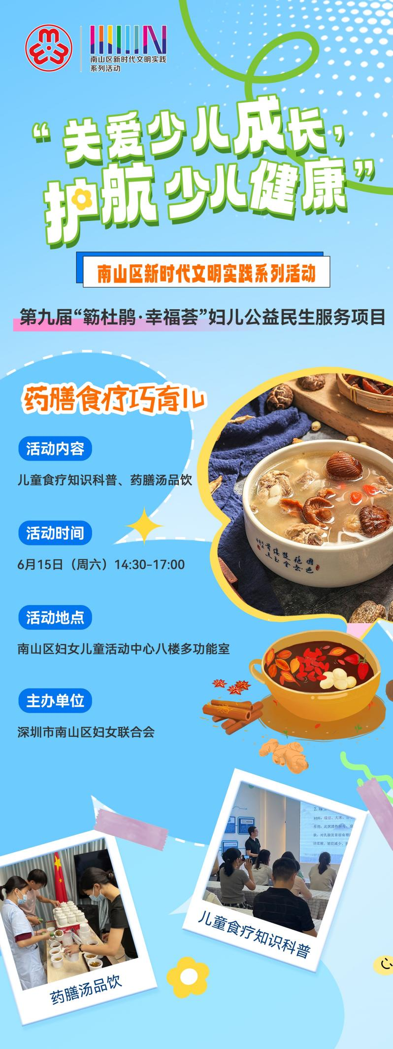 活动简介:药膳,既有果腹之用,亦有保健之功,兼具疗疾之效?!霸⒁接谑场?,药借食力,食助药威。根据不同气候、个人体质差异选择相应的药材和食材进行煲制达到改善体质、滋补保健的目的。本次活动不仅有儿童膳食营养专业指导,更有美味药膳汤品现场品尝,快来报名,一起踏上药膳世界的探索之旅吧!