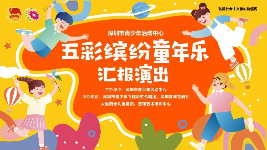 活动简介:为丰富青少年儿童的文艺生活,展示青少年才艺和精神面貌,深圳市青少年活动中心将举办“五彩缤纷童年乐”汇演活动。充分利用和依托校外教育服务阵地,涵盖童声合唱、儿童歌舞、语言表演和京剧等丰富组合,让孩子们在快乐的氛围中展示才艺,打造一次欢乐、精彩、丰富的美好视听盛宴。