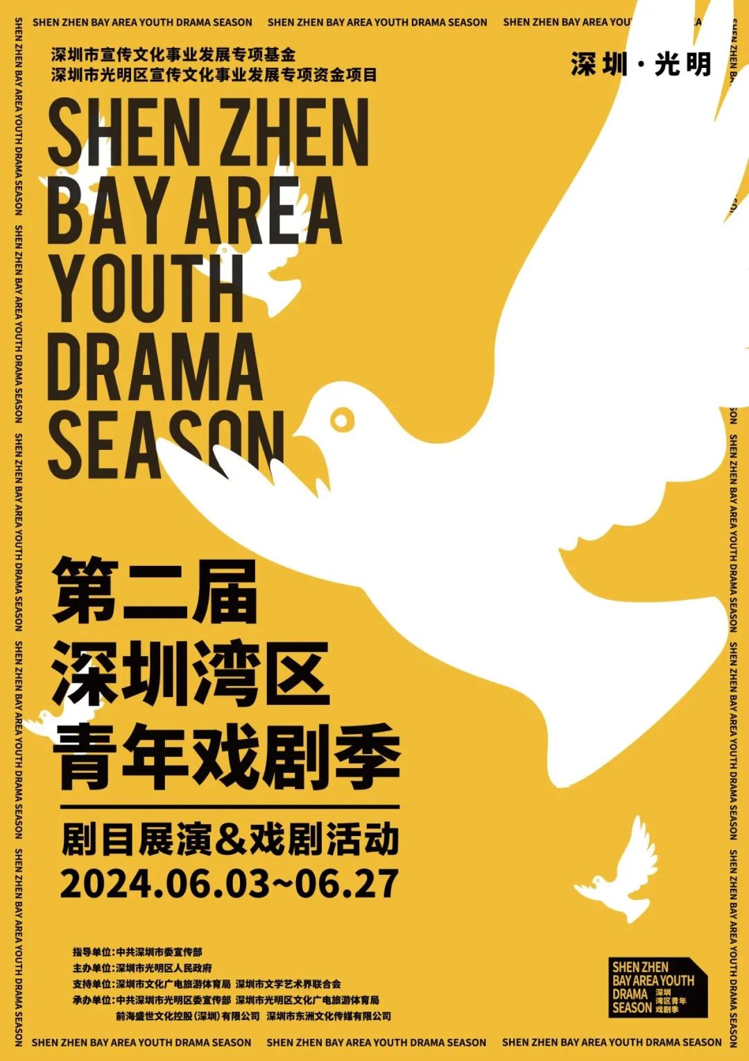 活动简介:深圳湾区青年戏剧季由中共深圳市委宣传部指导,深圳市光明区人民政府主办,深圳市文化广电旅游体育局、深圳市文学艺术界联合会支持,中共深圳市光明区委宣传部、深圳市光明区文化广电旅游体育局、前海盛世文化控股(深圳)有限公司等共同承办的国内首个创投型青年戏剧活动,紧紧围绕“青年”“原创”“粤港澳”主题,坚持以打造“青年戏剧人才聚集地”“青年剧目创作孵化基地”“青年创作剧目首演地”“青年演艺空间集聚群”为核心,以推动戏剧艺术人才培育、精品创作和传播交流为抓手,以建设“光明戏剧生活谷”为目标,旨在推动深圳青年戏剧事业发展,深化粤港澳大湾区戏剧艺术交流合作,打造具有国内外影响力的青年戏剧品牌。