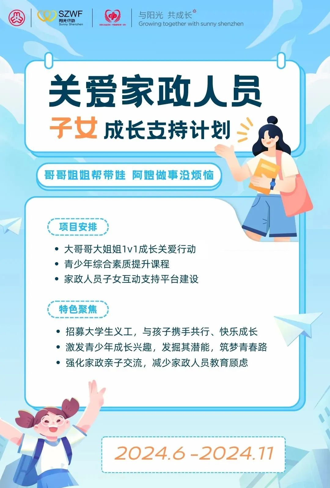 活动简介:随着社会的发展和人们生活节奏的加快,家政服务已经成为越来越多家庭的需求,家政人员为我们的生活提供便利的同时他们的子女却因为父母的工作繁忙而缺乏陪伴和关注。为此,深圳市妇联发起关爱家政人员子女成长支持计划,通过招募大学生志愿者为全市100个家政人员子女提供关爱成长服务。