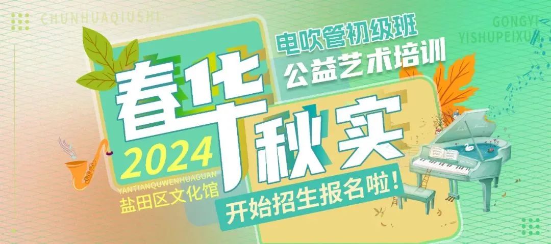 活动简介:深圳市盐田区文化馆已成功开办多期电吹管零基础公益培训课,为热爱电吹管的人群开启了一扇通往音乐艺术殿堂的大门。为了满足更多音乐爱好者的学习热情,盐田区文化馆将增设“春华秋实”电吹管初级班公益培训课。