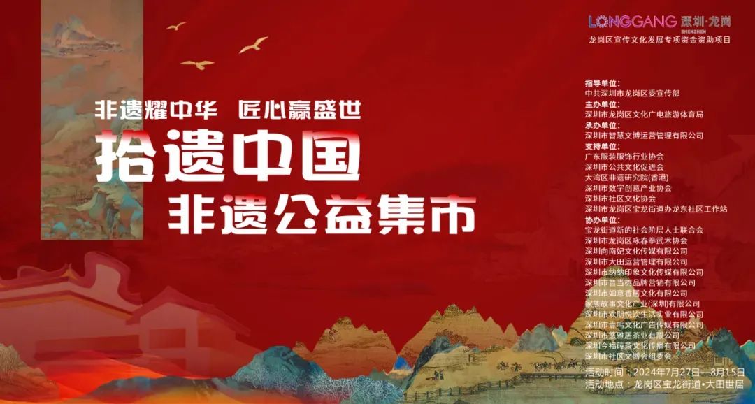 活动简介:7月27日,由深圳市龙岗区宣传文化发展专项资金资助,中共深圳市龙岗区委宣传部指导、深圳市龙岗区文化广电旅游体育局主办,深圳市智慧文博运营管理有限公司承办,深圳市纳纳印象文化发展有限公司等机构协办的“拾遗中国”非遗公益集市活动即将正式开启!