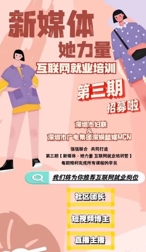 活动简介:“新媒体·她力量”全职妈妈及困境女性互联网就业培训项目,由深圳市妇女联合会主办,深视娱乐传媒(深圳)有限公司承办,主要服务内容包括:社区团长就业培训、孵化新媒体账号&直播培训。