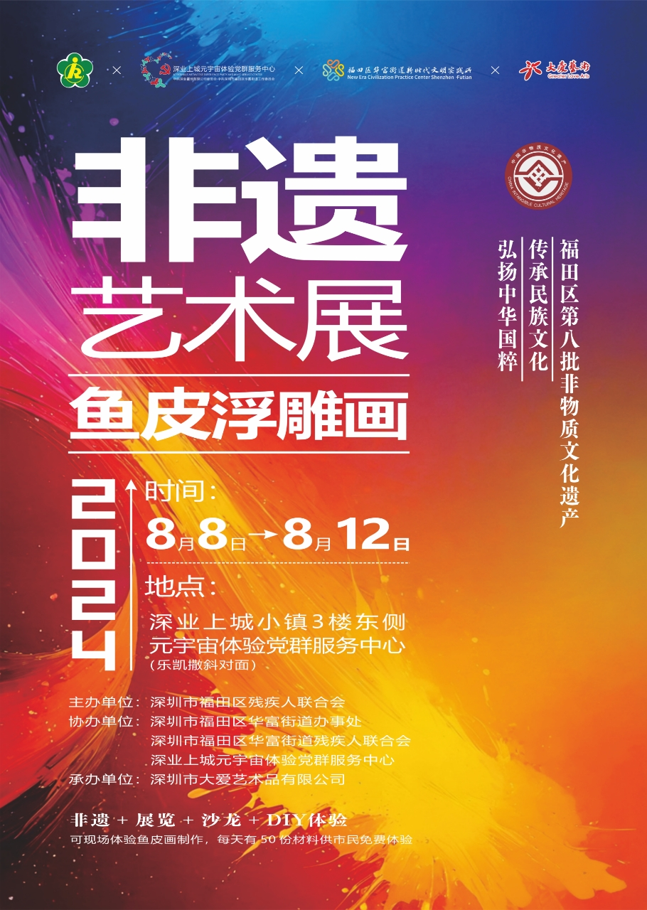 活动简介:8月8日至8月12日,福田区华富街道深业上城元宇宙体验党群服务中心携手国家级非遗工匠宁雷等残疾人艺术家,共同编织一场关于非遗与梦想的绮丽篇章——鱼皮浮雕画非遗艺术展,观摩看展还有机会亲手制作鱼皮浮雕画。此次活动不仅是一场文化盛宴,还是一个促进社会各界与残疾人相互理解、相互支持的重要平台,更是给予残疾人一个展示自己精彩人生的机会,鼓励更多人参与到扶残助残的行动中来,共同营造包容和谐的社会氛围。