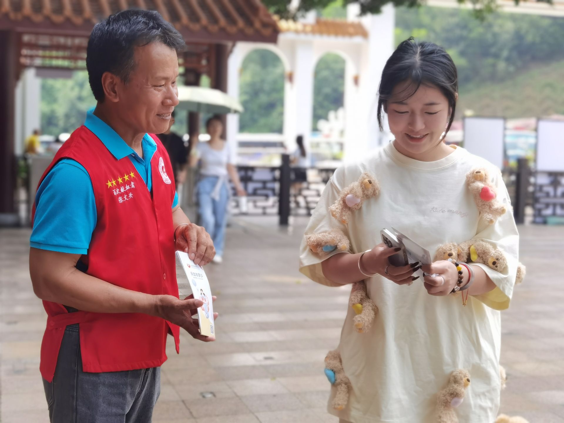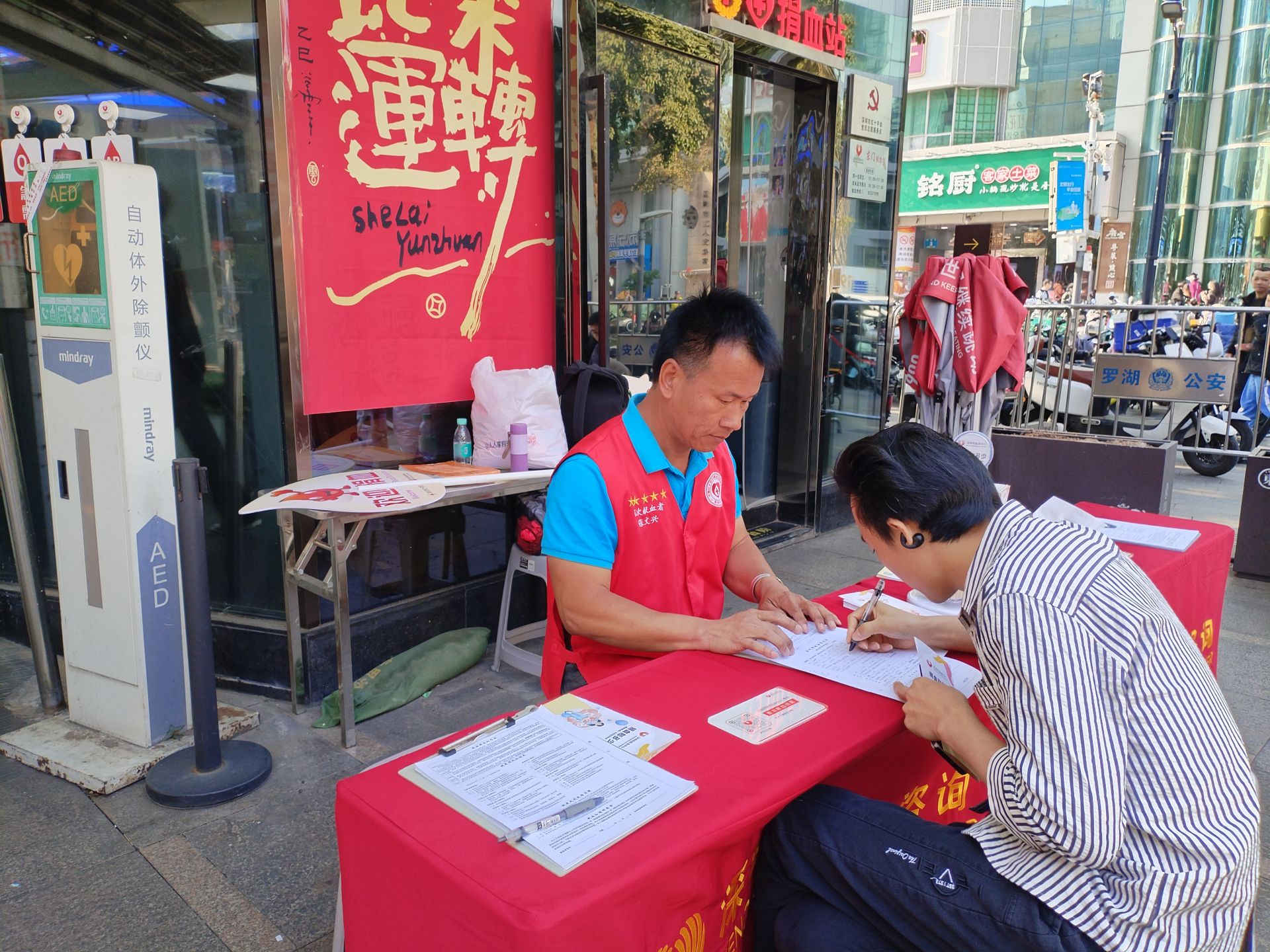 在长期献血过程中,志愿者的暖心服务让张文兴深刻体会到:“献血百次,不如劝人献血一次”。2023年,他主动加入深圳市红十字会无偿献血志愿工作者服务队,从无偿献血者,成长为志愿工作者。无论高温酷暑还是台风暴雨,他总是坚守在街头献血点,用自己的亲身经历积极宣传、主动招募,带动更多市民加入无偿献血行列?!凹堑糜形荒昵崛颂晡业墓适潞螅唤鲎约合籽估呕锇橐黄鹄?,那一刻我明白,爱心能传递,只要人人都献出一点爱,世界将变成美好的人间?!闭盼男烁卸厮?。截至目前,他的累计志愿服务时长已达4470小时。在两年多的时间里,他有超过600天坚守在志愿服务一线,有捐血者开玩笑说他是“长期经过太阳炙烤的人”。