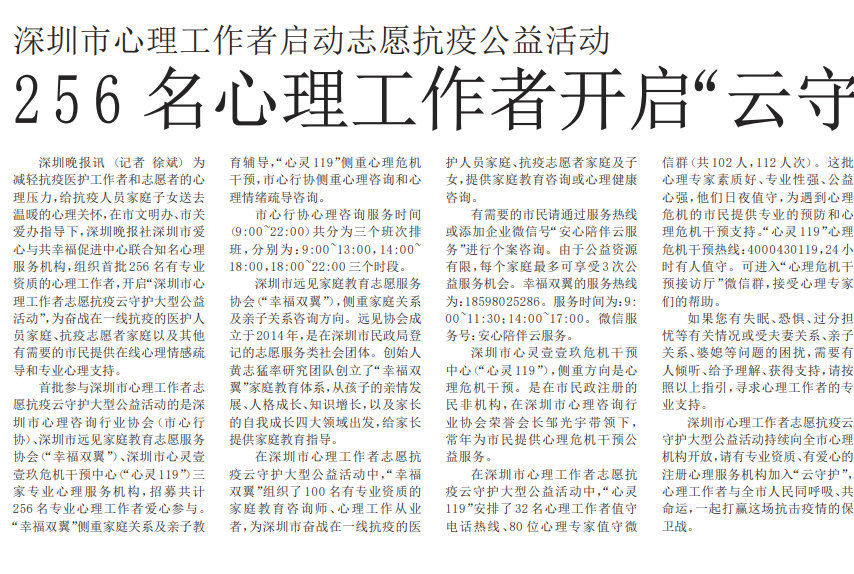 深圳市256名心理工作者为抗疫市民开启“云守护”